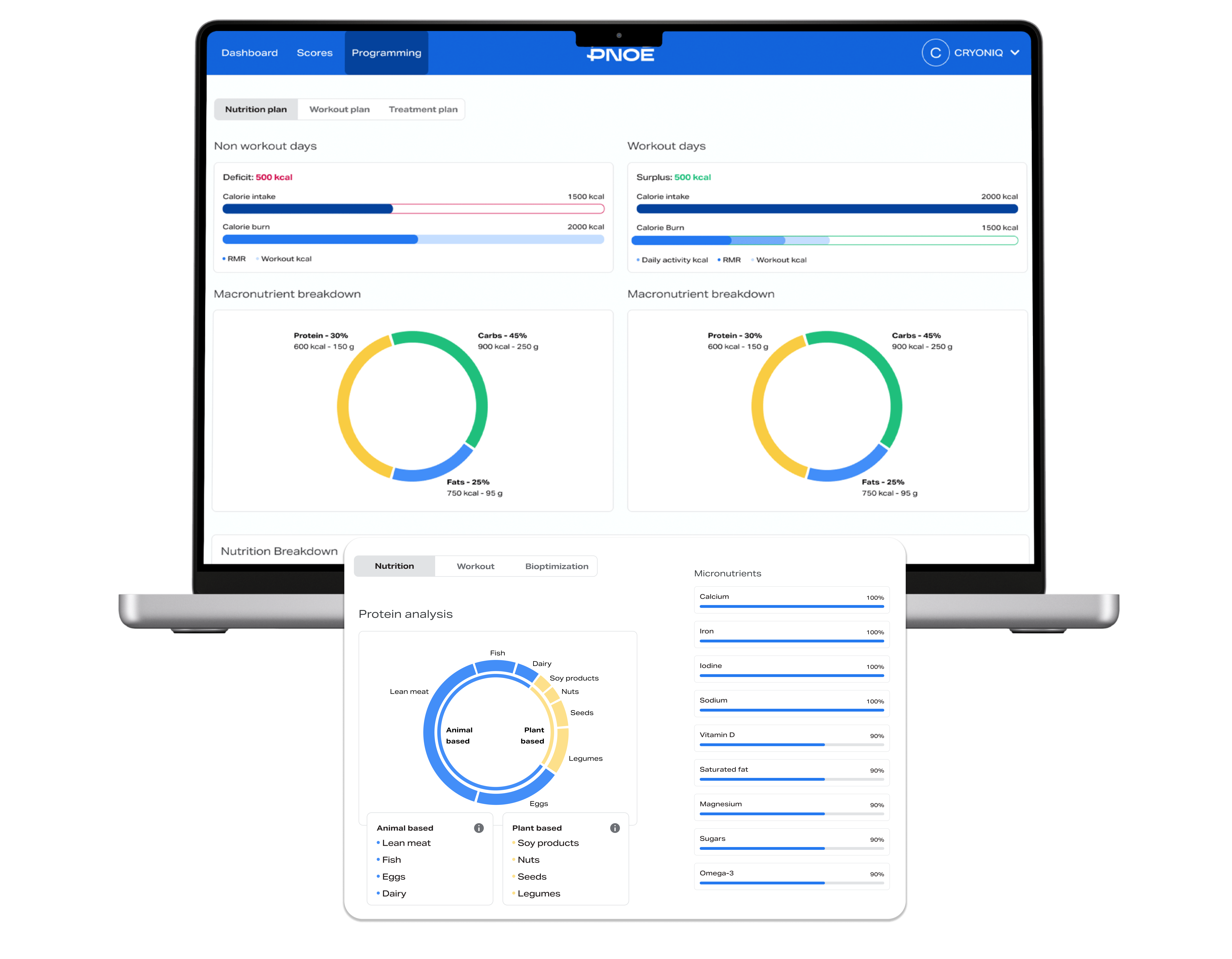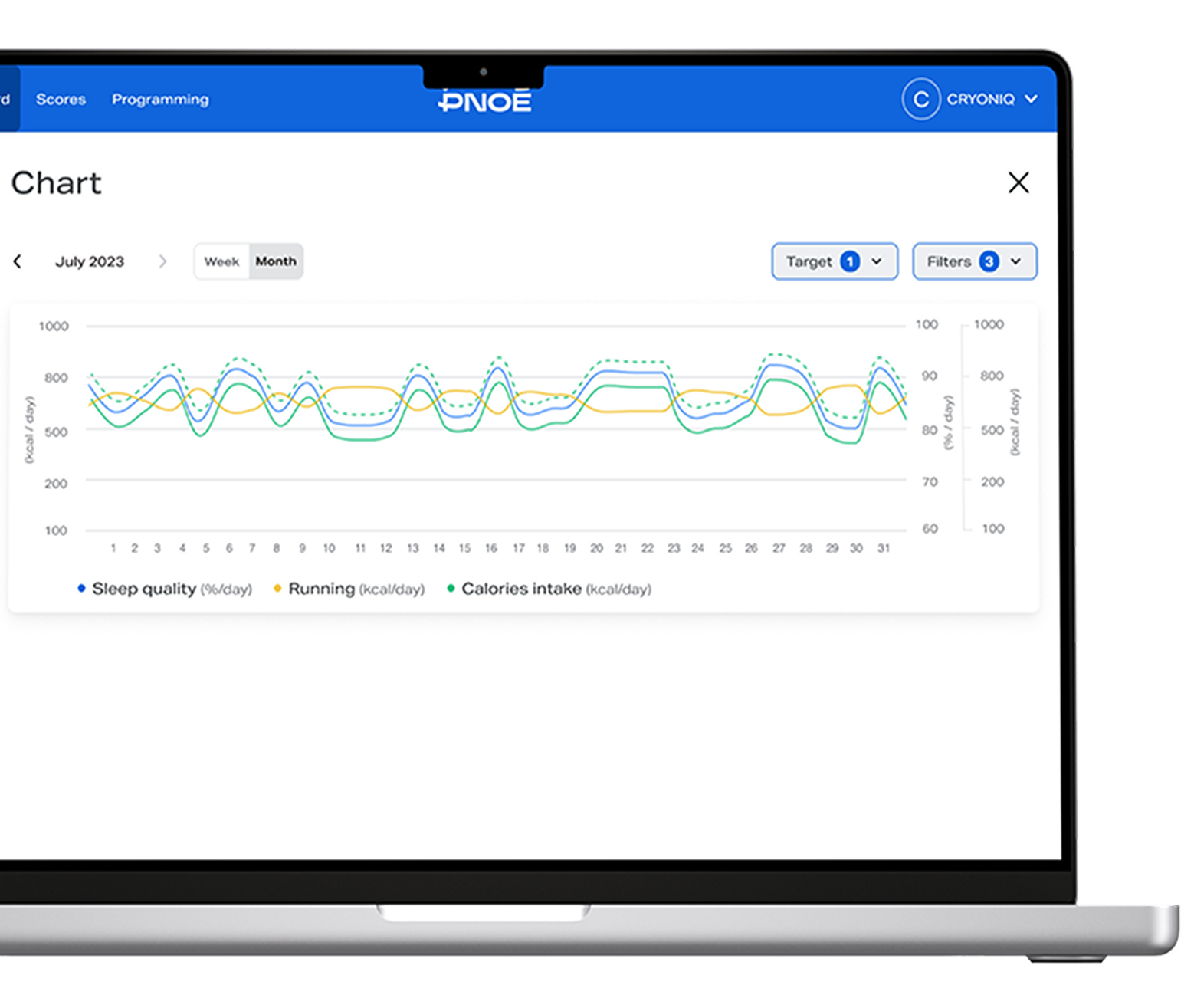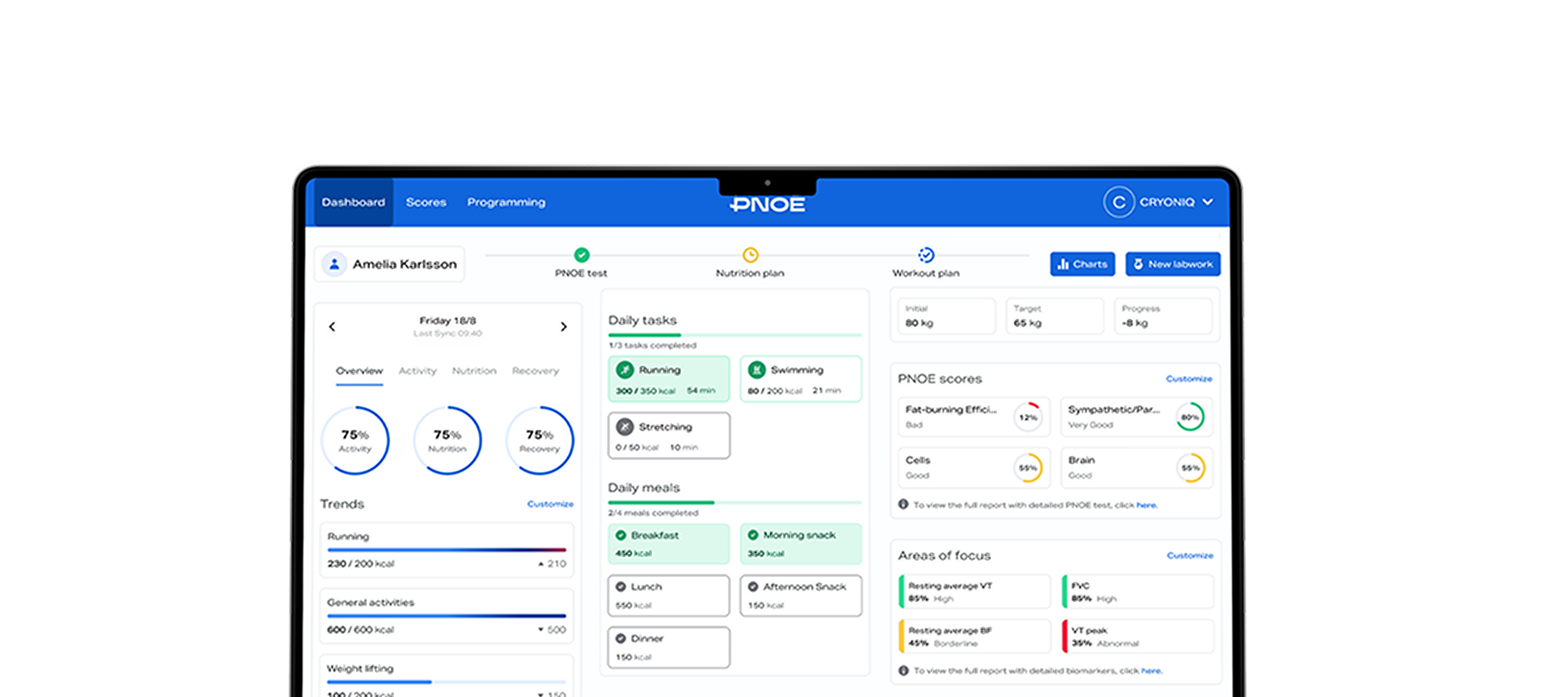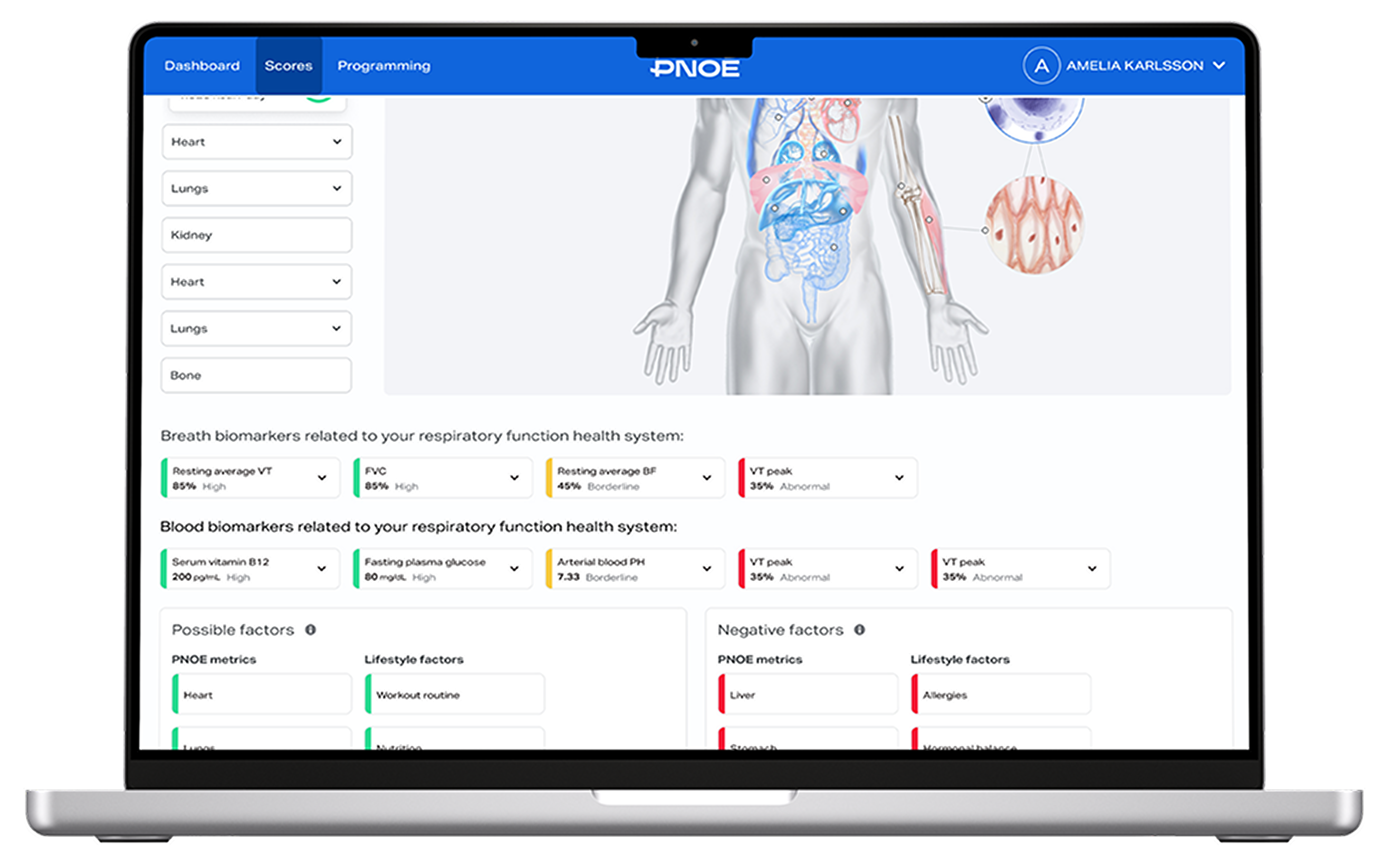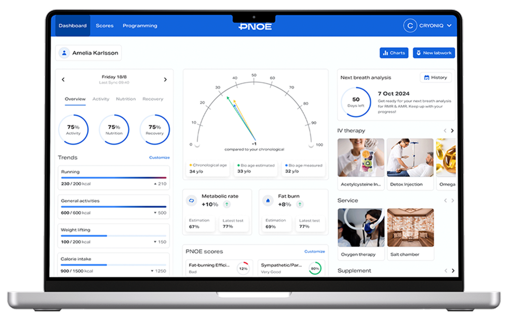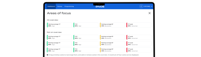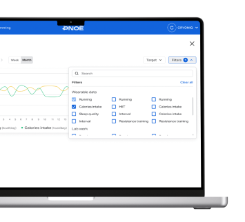 The PNOĒ dashboard allows you to merge and visualize biomarkers from any assessment, such as blood, DNA, urine, stool, saliva etc., as well as wearable data from any tracker. This combined view of labwork and wearable data unlocks unique insights into your clients’ physiology and unprecedented accuracy in program personalization.